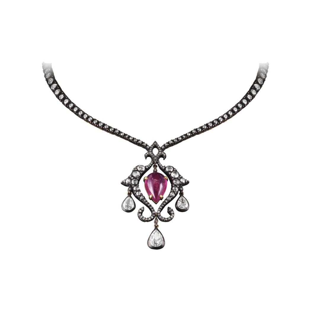 A ruby-gold necklace is a timeless symbol of elegance and luxury, blending the fiery allure of rubies with the lustrous beauty of gold. Each radiant ruby, with its deep red hue, exudes passion and vitality, while the meticulously crafted gold setting adds a touch of opulence and sophistication. Such a necklace not only enhances one's appearance but also holds sentimental value, often passed down through generations as a cherished heirloom. Whether worn as a statement piece for special occasions or as a daily adornment, a ruby-gold necklace captivates with its radiant charm, serving as a testament to both the wearer's refined taste and the enduring allure of fine jewelry.